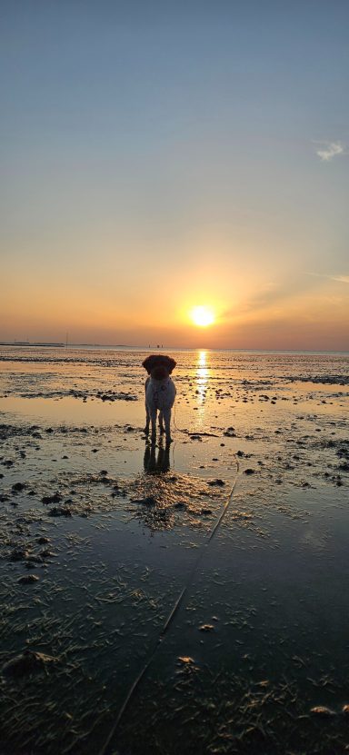 Wenn wir nachmittags unseren Spaziergang bei Dagebüll machen, kommen wir oft zur Sonnenuntergangszeit. Ich bin gespannt ob ich auch mal so früh aufstehe und einen Sonnenaufgang genießen kann. Denn ich bin nicht gerade eine Frühaufsteherin.🙃
